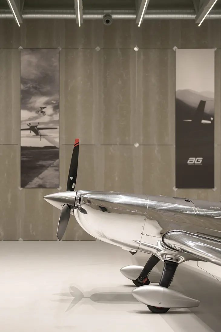 Flooring remains utilitarian and precise: a seamless polymer surface in the main hangar and durable vinyl on the second level, both selected for performance and maintenance efficiency. Across all spaces, the interior prioritizes clarity, flexibility, and operational readiness.