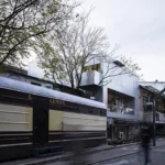 The extension introduces a vertical rhythm that contrasts with the original horizontal lines of the facade. By embracing the red colors found in the existing structure, the design achieves a harmonious yet distinctive addition. The result is a clear visual distinction between the building’s historic foundation and its contemporary adaptation, reflecting the coexistence of two distinct eras.