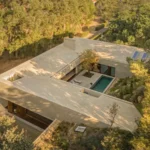 The space draws influence from the cultural dynamism of Hyderabad, incorporating details that reflect both local and modern sensibilities. Red and black columns reference traditional Indian architecture, while raw concrete ceilings emphasize structural depth. The interaction of warm tones and bold contrasts mirrors the vibrancy of Indian aesthetics, while expansive glass windows connect the interior to the lush surroundings, softening the distinction between indoor and outdoor environments.