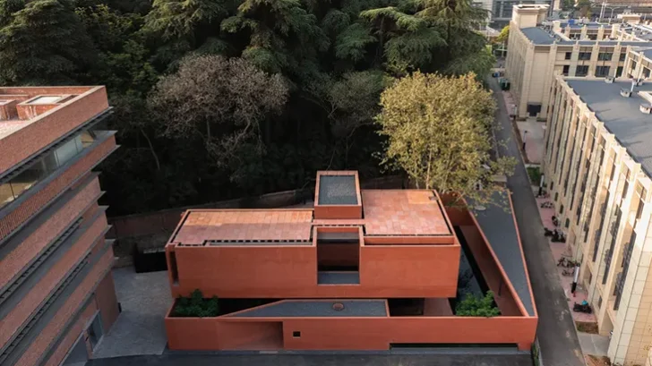 Mix Architecture completed Red Box in Nanjing as a compact commercial structure defined entirely by red concrete. The project sits within the former industrial grounds of the Nanjing Combat Machinery Factory, established in the 1950s and later integrated into Red Mountain Park. The architects approached the building as a physical response to layered meanings of red within the site. The color reflects the industrial past, the red brick factory structures, and the iron-rich soil of Red Mountain itself. Red Box translates these references into a single material expression, using concrete enriched with iron oxide to create continuity between geology, architecture, and memory.
