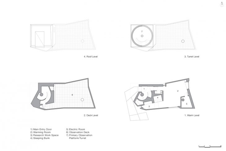 As a counterpoint to the exterior and its context, the interior is lined with fir plywood, creating a haven of refuge and warmth from the harsh surroundings. The first floor is comprised of a research office, sleeping bunk, and warming room, and is super-insulated to prevent interior/exterior temperature differentials from creating heat eddies that would impede astronomical viewing. A helical stair leads from the cantilevered entry canopy to a fissure in the cladding that opens onto the exterior observation deck. Continuing, the stair arrives at the observatory’s primary viewing platform inside the faceted turret, its interior characterized by high ceilings, a larger telescope, and a camera array. A single person can rotate this turret by hand with an assembly typically used in high-precision manufacturing facilities, and a hand-cranked sliding hatch opens the telescope to the sky. A rift in the zinc cladding creates a corner window, framing Polaris when the turret is locked into the southern cardinal position.