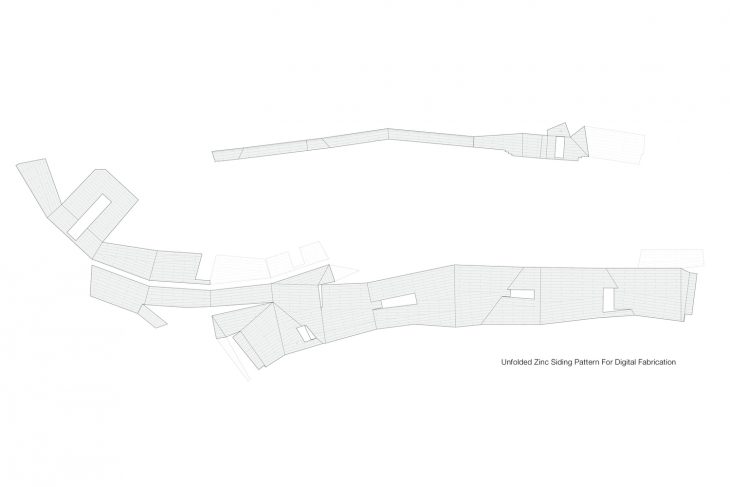 Gemma’s design rejects a traditional dome in favor of a synthesized architectural form that maximizes usable space and responds to the stark geographic context. Its continuously faceted shape reflects the surrounding landform, and terraced concrete platforms transition between the summit’s bedrock and the building foundation, knitting together natural and man-made landscapes. An unconventional pattern of lock-seamed zinc cladding mediates between the irregular site topography and the building’s geometry, reflecting Gemma’s orientation to both geological and celestial landmarks. Its dimension, color, and patina evoke a material relationship to the gray granite outcroppings, while its heat transfer capability facilitates sky observation by minimizing temperature differential distortion.