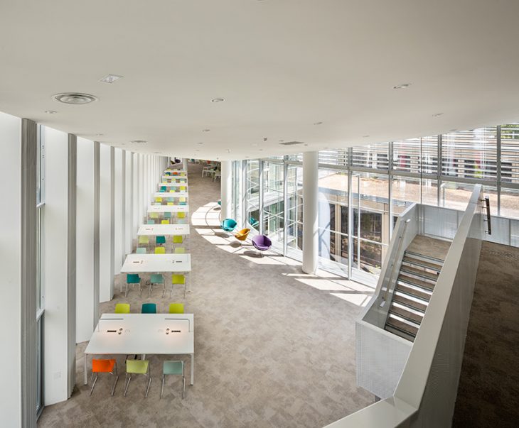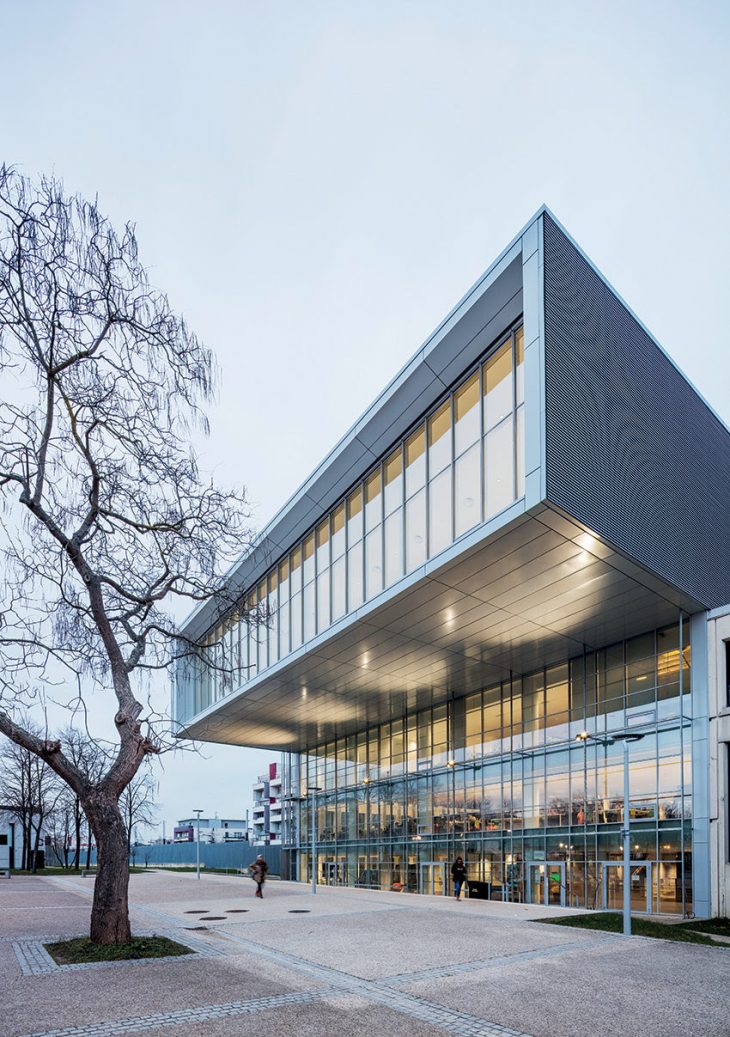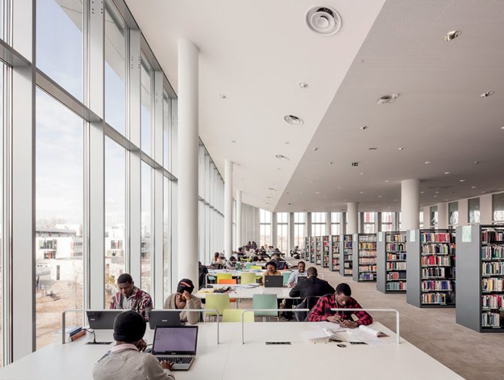 The morphology of the new building is adapted and deformed while ensuring the continuity of the urban façade. Derived from the characteristics of the campus, aligned with the existing library (G+2) and rising in a movement that reveals the life of the reader unfolding inside the library and fitting into the urban landscape and the line traced by the tramway.