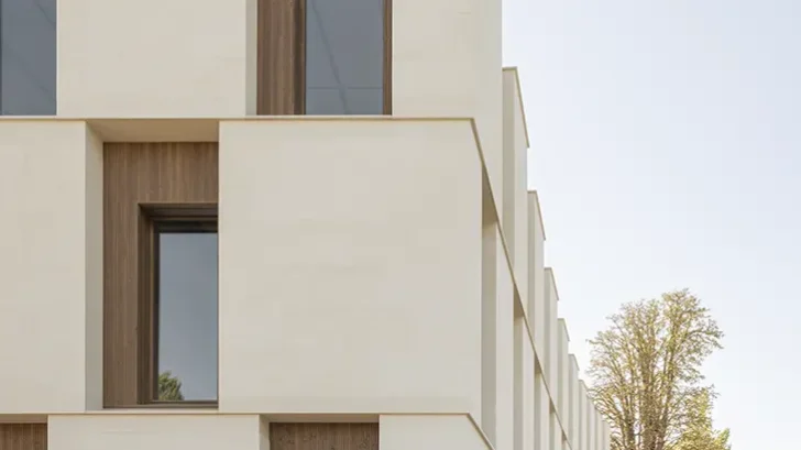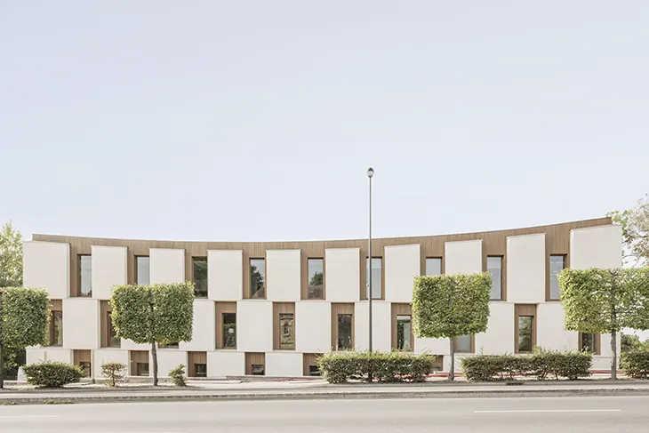 Each elevation is treated with equal precision. The façade’s modular grid alternates stone panels and wood-framed window recesses in a checkerboard rhythm that balances transparency and solidity. Subtle variations in depth animate the surface, while the restrained palette emphasizes texture and light. The architectural clarity of this grid expresses both efficiency and refinement, establishing a visual coherence across the campus.
