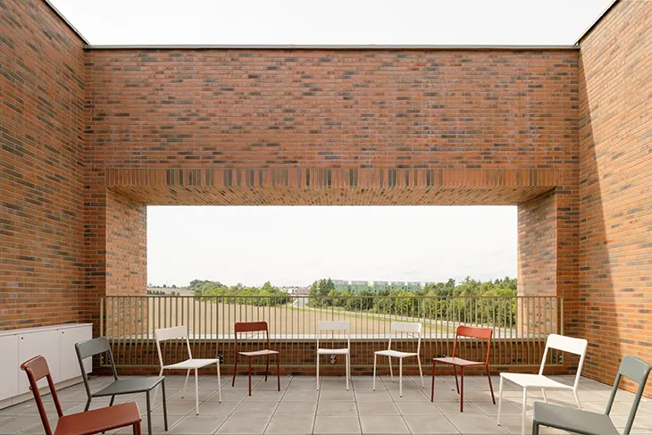 The site plays a critical role in shaping the architecture. Located on an elongated, sloping plot near the center of Chýně, the school currently stands at the edge of a developing residential area. Over time, it will become embedded within a denser urban fabric. OVA’s design addresses both scenarios by establishing a clear and legible public space that works in isolation now while remaining ready for future integration into the town’s structure.