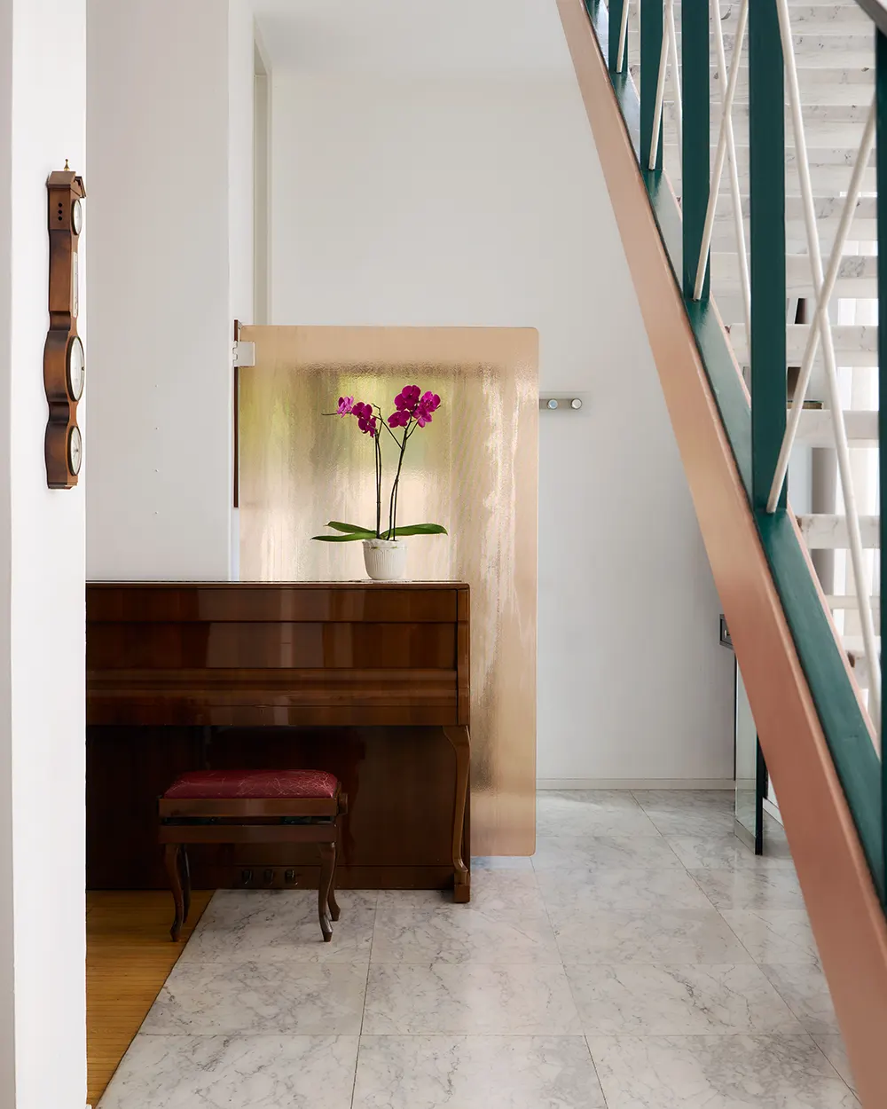 A short distance away, Villa Pestarini offers a completely different architectural register. Built between 1938 and 1939, the villa reflects Franco Albini’s rationalist approach with precision. Its rectangular form, white surfaces and glass-block elements present a clear study of proportion. Large windows draw the garden into view, emphasizing structure through light and geometry. The owners have safeguarded the villa with exceptional care, allowing visitors to encounter Albini’s work with fidelity. Details such as the shallow marble staircase, the sliding partitions and the bespoke furniture show the consistency of Albini’s ideas and the discipline behind his spatial approach. The house appears suspended in its original context, untouched by city noise or shifting trends.