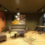 The setting also features the tactile presence of the Kasane 36 clay-covered table by nendo and Zelo chairs from Rex Kralj. Small islands of relaxation form around Mates 04 poufs, complemented by Eidos 143 tables and compact side tables from the Brise and Inout series.