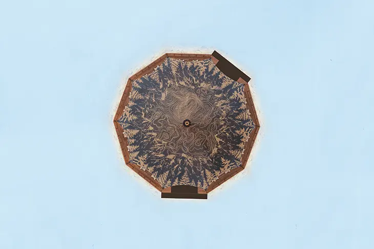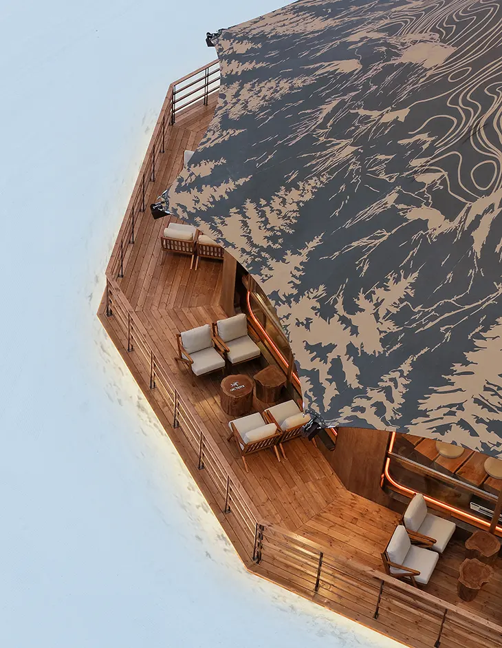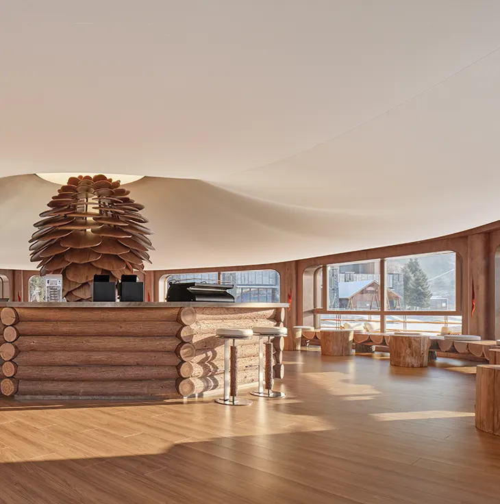 The second narrative, “Recharging,” shifts the focus toward rest and social interaction. The café, centered around the “Pine Flame Core,” introduces a contrasting atmosphere that still aligns with the alpine context. This sculptural installation, inspired by the structure of a pinecone, uses layered forms to suggest contained energy. Light emerges from within the structure, creating a focal point that draws visitors inward. Seating arrangements remain low and grounded, with wood surfaces and compact configurations that support informal gathering. Views toward the slopes maintain a visual connection to the exterior, ensuring the experience never detaches from its environment.