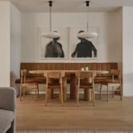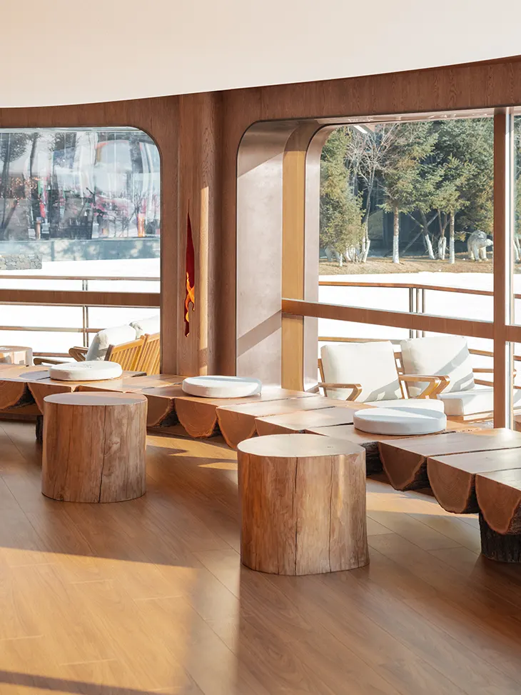 Material choices play a critical role in balancing exposure and comfort. Raw timber, metal, glass, and textiles appear throughout the interior, each selected for durability in a demanding climate. The design references alpine cabins without relying on direct imitation. Instead, it abstracts key qualities such as warmth, density, and tactility. Elements like stump seating and metal-pressed tabletops introduce subtle references to outdoor culture, while curved upholstered seating supports recovery after physical activity. The result is a space that feels grounded and practical, without leaning into decorative excess.