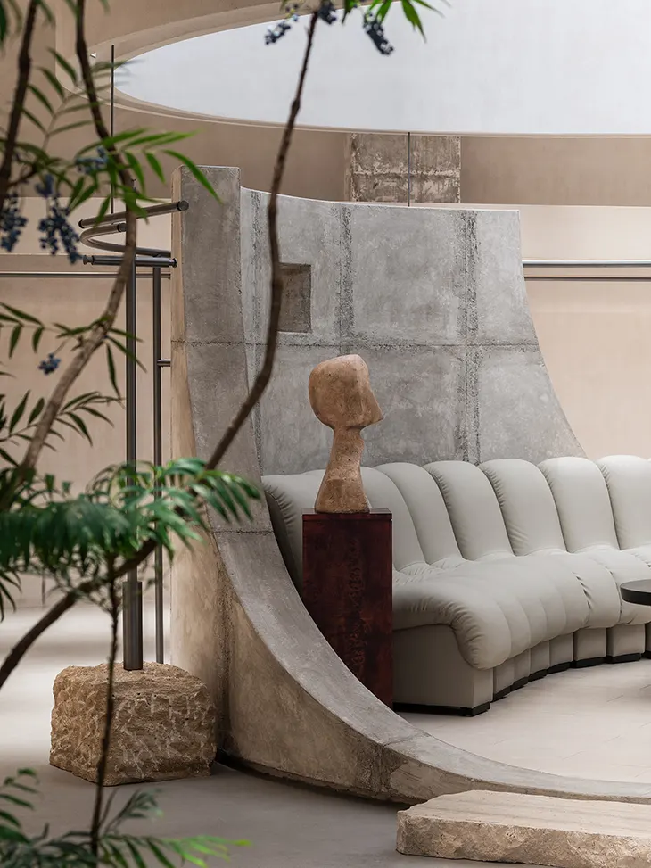 Material choices anchor the atmosphere. Exposed concrete establishes a raw, grounded presence, while liquid stone made from petrified wood introduces a warmer geological texture. Their contrast defines the spatial tone without relying on ornament. At the center of the store, an elliptical island marks the starting point of the retail journey. Surrounding walls gently peel away from the original structure and curve inward, forming an enclosure that feels composed yet open.