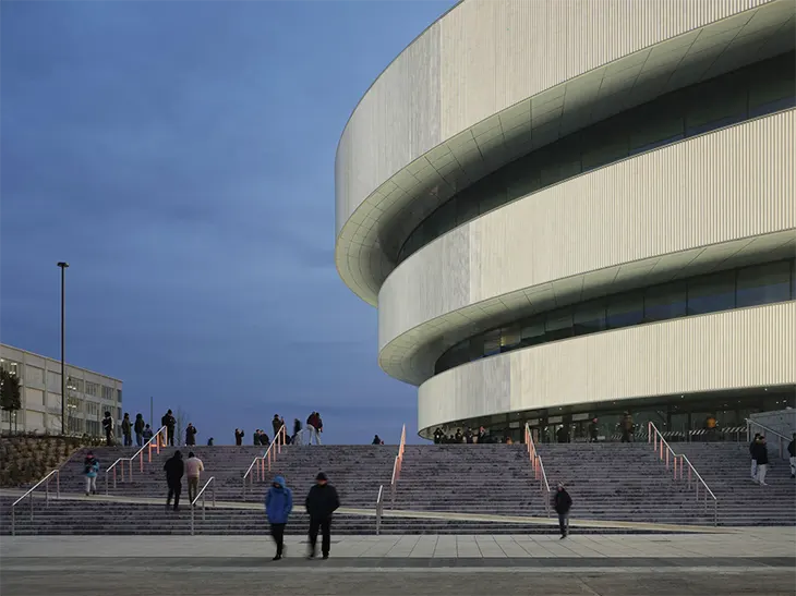 Rising from the podium, three concentric rings of increasing height wrap around the structure, creating the arena’s distinctive profile. These elements appear to hover above one another, lending the building a sense of lightness despite its scale. Their metallic surface is composed of aluminium tubes that respond to daylight with subtle shifts in reflection. At night, integrated LED systems transform the rings into a luminous presence, reinforcing the arena’s role as a landmark within the district.