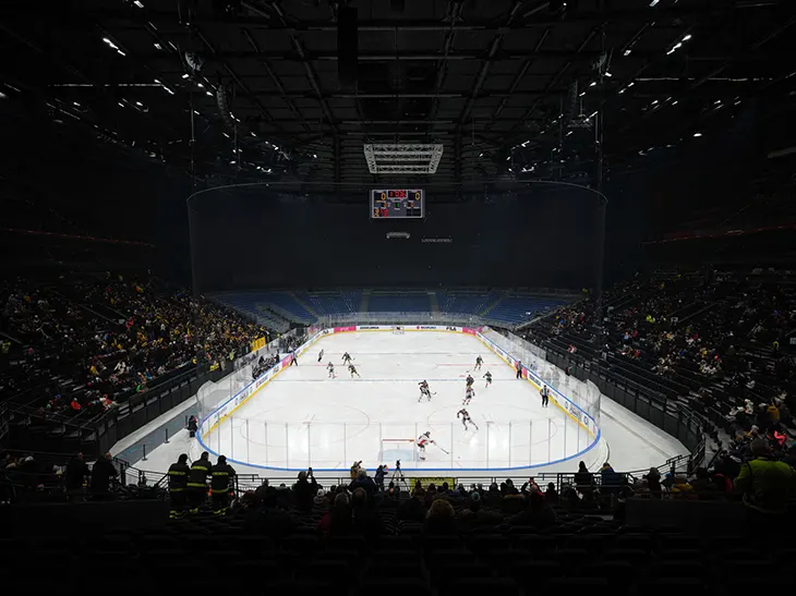 Inside, the arena is organised for clarity and accessibility. Two seating tiers rise above the parterre, complemented by an upper level housing lounges and sky boxes. Circulation occurs through generous lobbies on each level, ensuring direct access to seating, catering, and services without congestion. Parking is integrated discreetly within the podium and supported by a separate multi-storey facility to the north, maintaining the continuity of public space across the site.