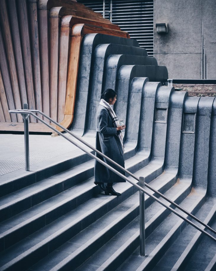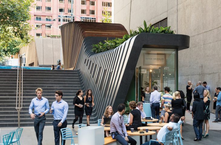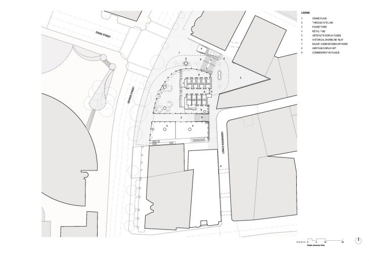 The ground of the new building, kiosk and public space is formed in stone, curved and folded up to create steps, and a place to display the site’s archaeological findings from Sydney’s colonial and Victorian-era.