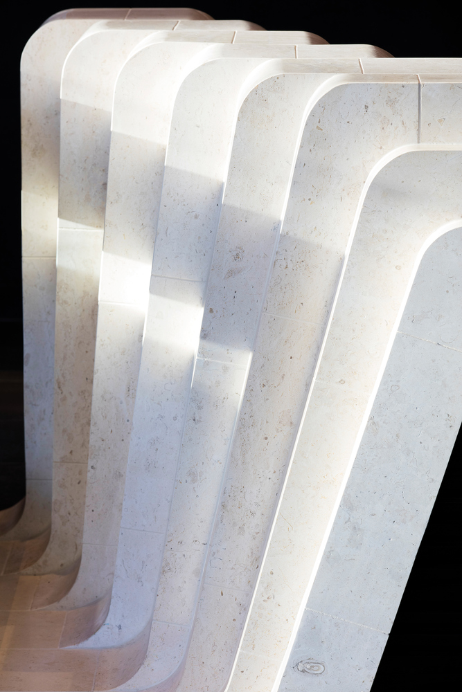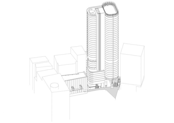 The beautiful Yellow Block sandstone on which this City and our site rests was quarried and blocked, and is used to clad the core of the new tower, rising from the earth to form the spine of the new tower.