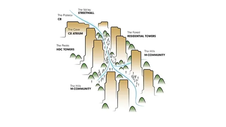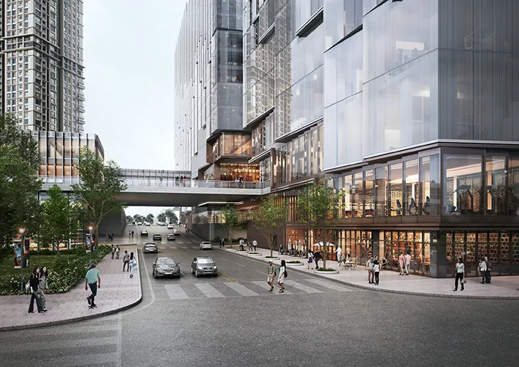 The Cube, located at the western edge, forms the clearest architectural statement within the masterplan. It brings together retail, offices, fitness, entertainment, and a hotel in a single mixed-use structure. A sky bridge connects the main volume to the Cube Nest, which extends the programming horizontally. Inside the Cube, office floors gather around a large collaborative atrium with a spiralling ramp that links each level. Stepped skylights draw daylight deep into the interior, while the rooftop terraces and a sunken garden create quiet outdoor zones.
