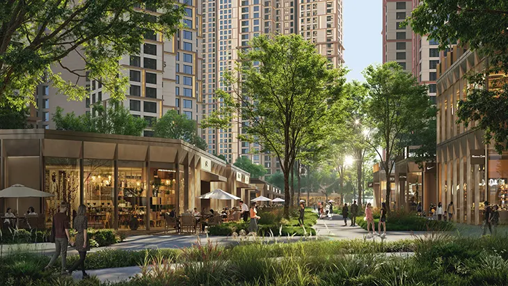 UNS structures the scheme through six conceptual layers known collectively as the Grand Circle of Life. These layers define how the neighbourhood functions and how its residents interact with one another. “From Cradle to Grave” drives the multigenerational focus, placing childcare, youth spaces, healthcare, senior care, and medical facilities throughout the neighbourhood. “Connected City” reinforces the 10-minute radius and the car-free structure. “Clockwise Living” shapes the 24/7 programme, which includes housing, restaurants, retail at multiple scales, cultural venues, sports facilities, a hotel, and a library. “Retail for All” sets a framework for a wide range of retail typologies, from malls to street-level pavilions. “The Four Seasons of SeoulOne” distributes greenery across rooftops, courtyards, water gardens, and a forest walk. “Transformation and Rebirth” positions the entire masterplan as a reinvention of an inactive brownfield site into a safe, contemporary neighbourhood.