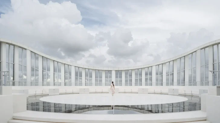 The interior diverges from the glassy exterior, intensifying the drama between inside and out. The 56th floor’s sequence of small spaces, exhibition areas, meeting rooms, lounge, are unified by continuous white arches, evoking the sensation of moving through iceberg caves. This design decision not only amplifies emotional impact but also redefines function as an immersive journey.