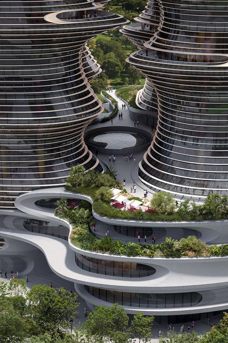At 165,815 square meters, the complex is designed as a place of convergence, drawing inspiration from the steep valleys and canyon formations found in the region’s mountain terrain. Terraces and balconies surround a central outdoor void described as the “canyon,” with circulation and sightlines organised around this architectural core. A large oculus at the base brings daylight deep into the interior, connecting indoor public spaces with the open void above.