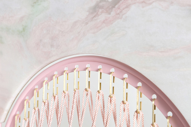 The collection features a set of chairs, a table that can be flipped upside down and a decorative screen panel. Handmade, silk-braided cords and tassels, pink marble and traditionally crafted stained-glass inserts were added to the powder-coated steel and fabric pieces.