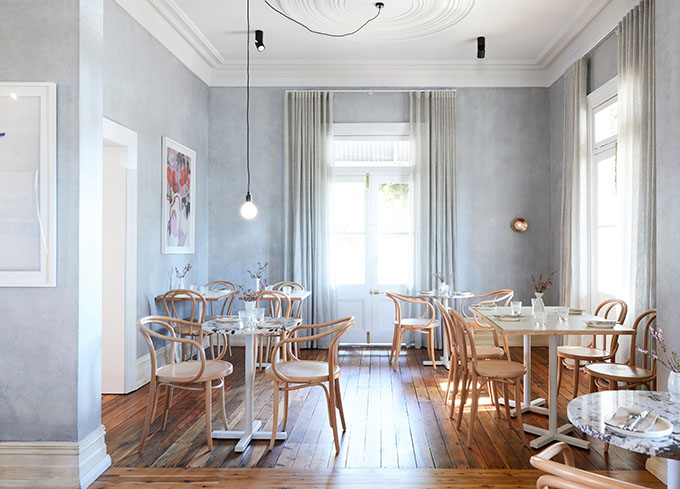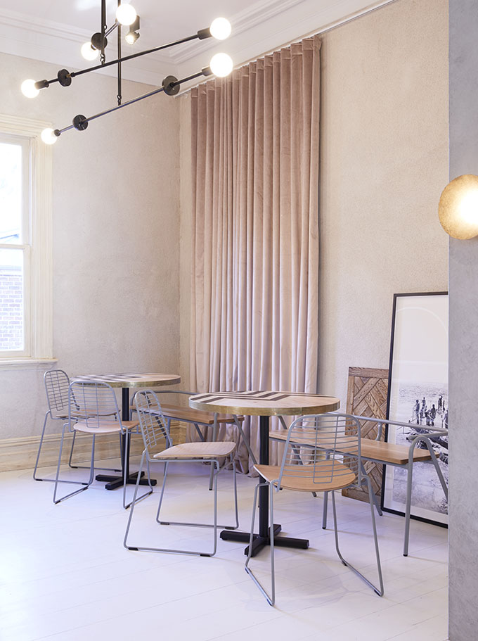 The pendant heavy layout of the cafe brings the lighting down and creates a feeling of intimacy present in the family home while upholding the regard for the heritage Architecture. Built in 1866 the traditional architectural elements have been paired with brutalist furniture and gothic inspired lighting in the form of the Volker Haug “U Chain” a custom “Flying Discus” and the “Oddments” pendant as well as an “Only U” and “Anton” wall fittings. What has been achieved is an unpretentious interior that captures the intimacy of a residential home remade into a commercial cafe that stays true to the buildings original intensions