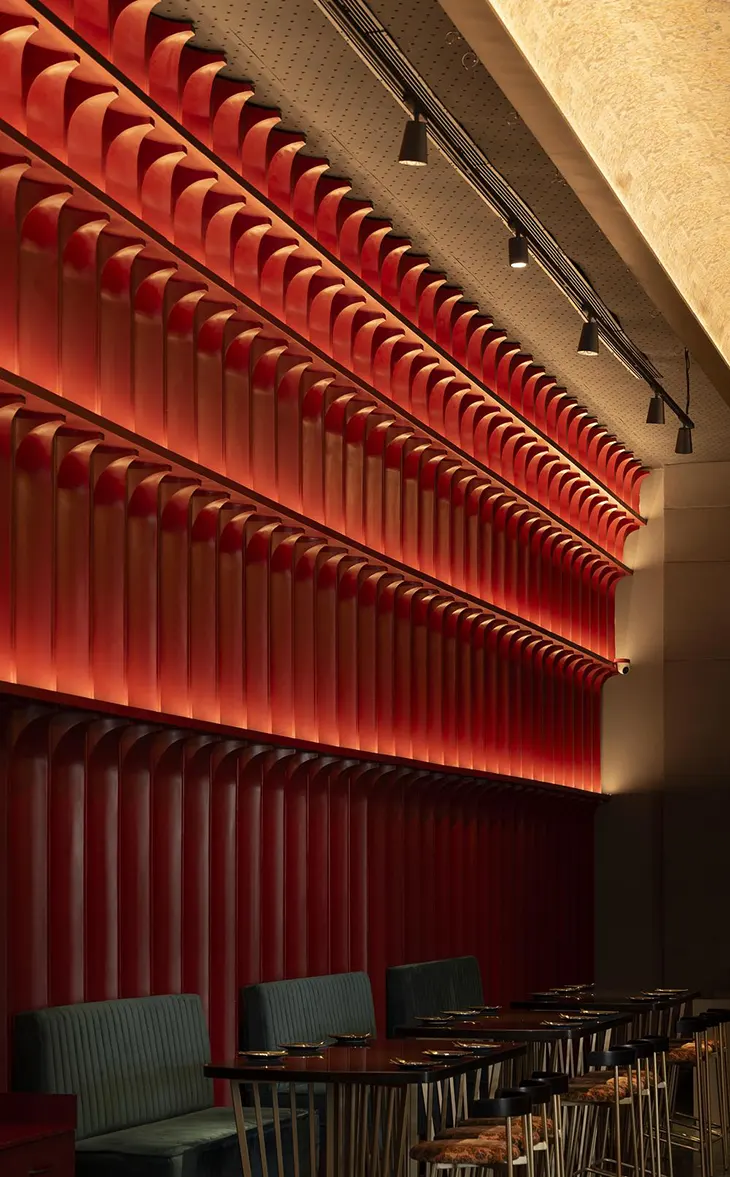 The interior establishes a strong visual framework through repetition and curvature, which the lighting strategy reinforces through controlled contrast. Ambient light sets a base layer, while focal accents introduce points of intensity that guide attention across the dining areas. This structure creates a rhythm that aligns with the architecture, ensuring that light works in tandem with form. Rather than flattening the environment, the system builds a sequence of visual moments that shift depending on position and movement within the space.