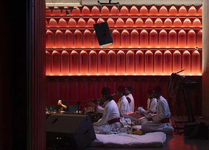 The surrounding walls extend this approach through a series of jharokha-inspired modules that introduce depth and articulation to the perimeter. Integrated linear lighting grazes these surfaces, emphasizing texture while maintaining a controlled luminance level. This technique allows the architecture to remain legible without overpowering the overall atmosphere. Operating at 2700 kelvin with a high color rendering index, the system ensures accurate perception of both materials and food, aligning visual clarity with the functional needs of a dining environment.