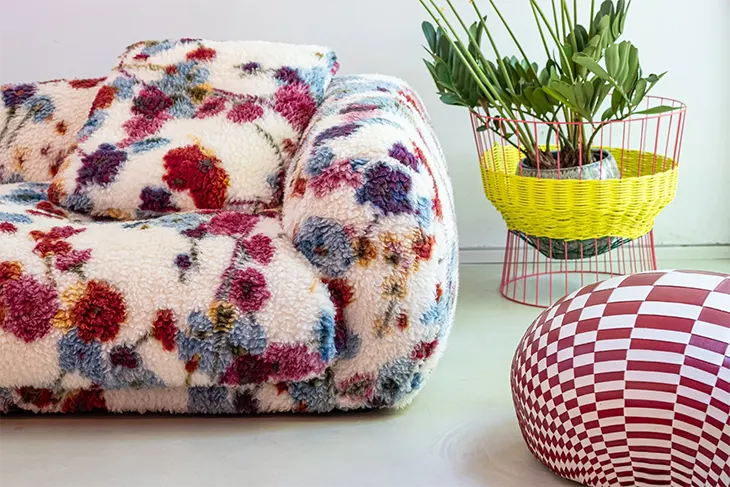 Me-Time represents the sophisticated end of this spectrum. Unlike vintage florals that can veer toward kitsch, Moroso’s interpretation maintains a contemporary edge through its textured bouclé fabrication and the sofa’s decidedly modern silhouette. The flowers feel almost impressionistic, scattered across the surface like a meadow viewed from above rather than the rigid repeats of traditional chintz.