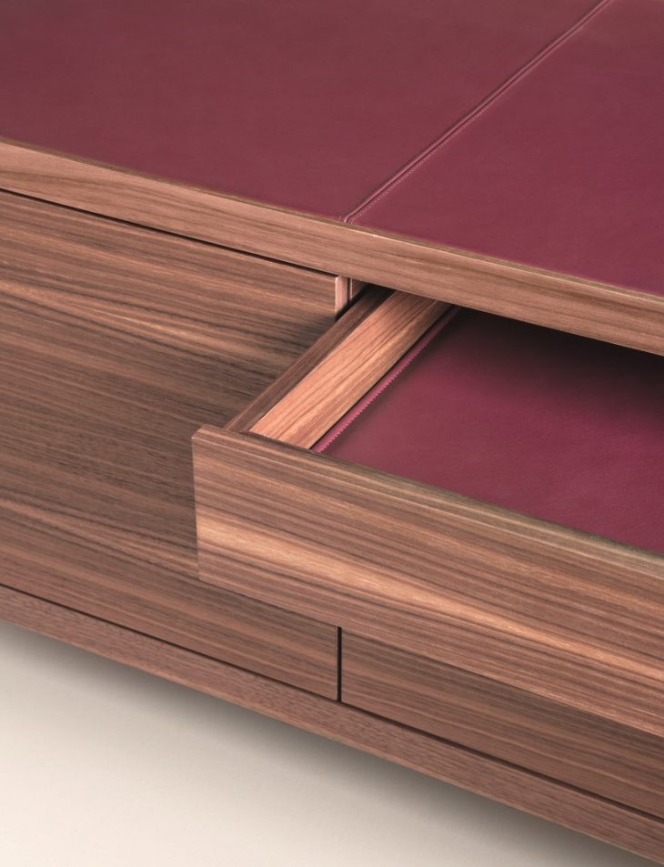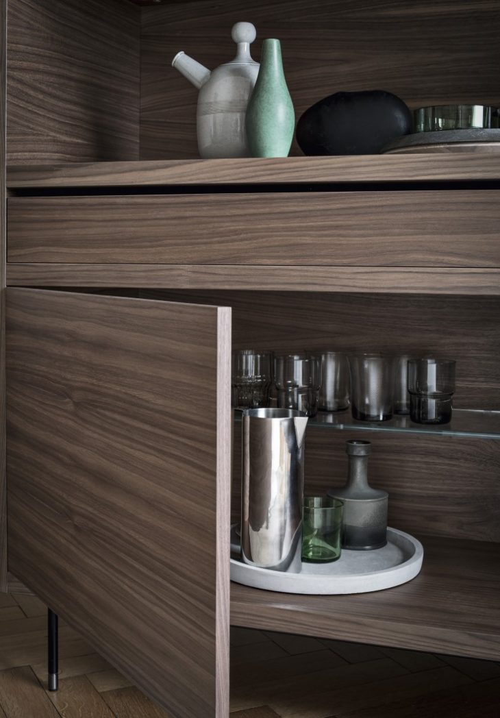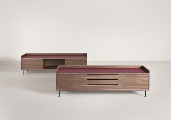 Christophe Pillet designed Privè, a group of storage units that unite 1960 style inspirations, contemporary lines and precious materials, taking care of details in its own characteristic mannerism. The concept combines elements of great materiality, such as its walnut case, the glass shelves and the leather details of the top and of the accessories, along with a design made of thin weights, 45° edges and the lightness of the four thin little legs in dark brushed steel tubing. Take a look at the complete story below.