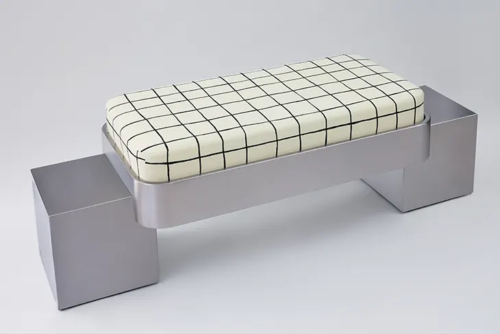 The NemanB01 Bench stands as the collection’s origin point. Two stainless steel cubes, each 36 × 36 × 36 cm, support a soft upholstered seat measuring 120 × 56 cm. With an overall length of 170 cm and a height of 44 cm without cushion, the piece balances structural solidity and textile comfort. Produced in an edition of 1/8, the bench introduces the recurring motif of the cube as both architectural unit and sculptural anchor.