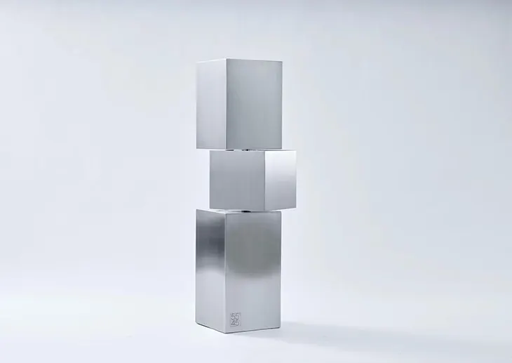 This geometric logic continues in the NemanST01 Nesting Tables system. Available in stainless steel or walnut veneer, the modular set includes four cube-based tables that slide within one another like matryoshka dolls. The top table measures 50 × 50 × 50 cm, accompanied by progressively smaller volumes. In steel, the system reads as a sequence of reflective blocks; in walnut, it becomes a study in depth and warmth. Both versions remain open edition, reinforcing adaptability and repetition as core principles.