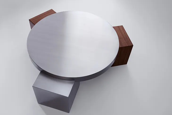 A circular steel tabletop resting on three 35 × 35 cm cube legs defines the NemanT01 Coffee Table. With a 100 cm diameter and 8 cm thickness, the top hovers above its cubic supports, merging circular and orthogonal geometries. The material pairing of stainless steel and walnut veneer introduces balance through contrast, where reflective surface meets tactile grain.