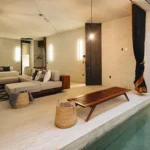 The Pool Club offers a 25-meter pool, sunbeds, hot tubs, and private cabanas, introducing exclusivity to the communal beachside spirit. Inside, furniture in solid timber and leather infuses warmth into the stone envelope, while lighting by Shaun Dudley adds a contemporary note through brass and cream-toned fixtures. Haven becomes both a dining hall and a retreat, linking Burleigh’s grassroots surf culture to Mondrian’s global lifestyle imprint.