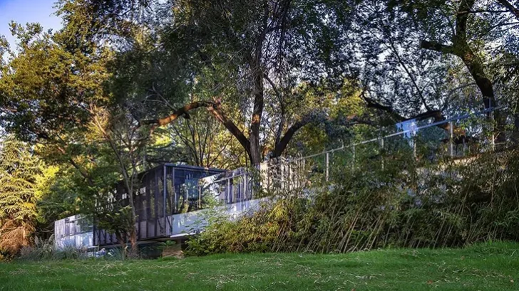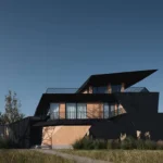 Material contrast strengthens this presence. A mirror-finish stainless steel volume anchors one end of the building, reflecting parkland and sky to soften its edge within the landscape. Along the main body, weathered Corten steel panels and dark-toned metal cladding introduce warmth and a sense of geological time. A perforated concrete-block screen lines the lower facade, filtering light and views between the interior and the covered terrace while establishing a porous boundary.