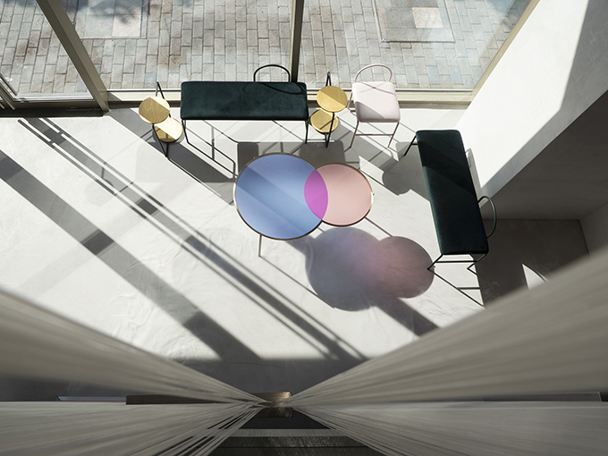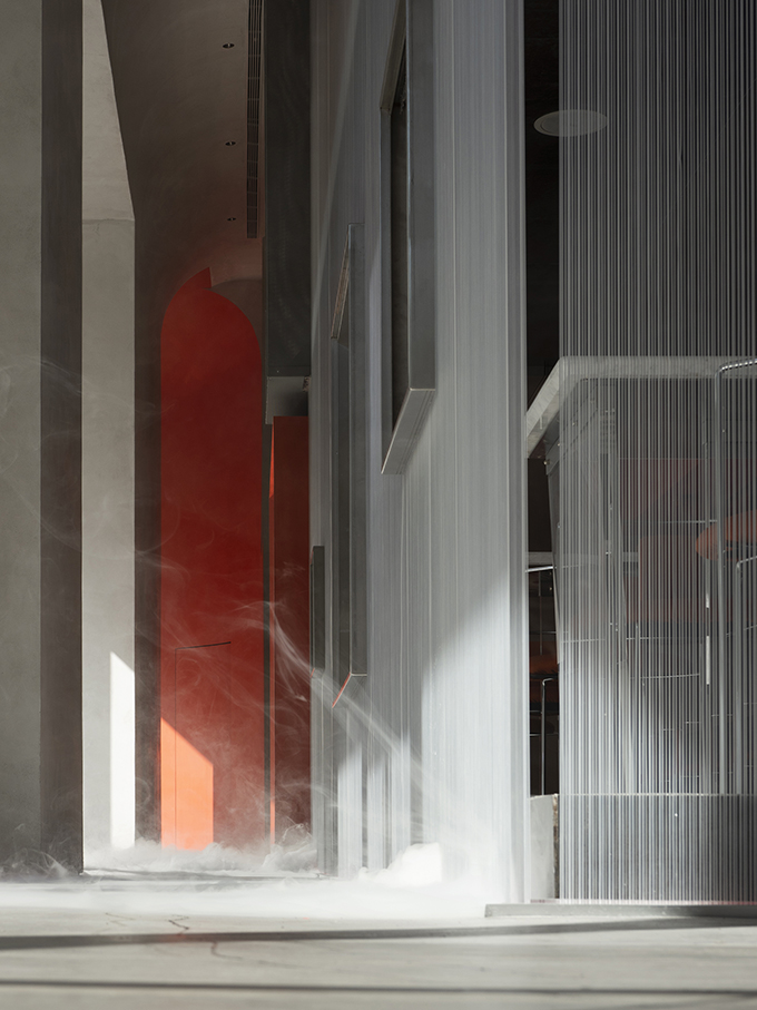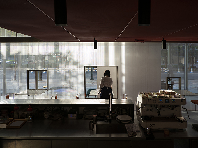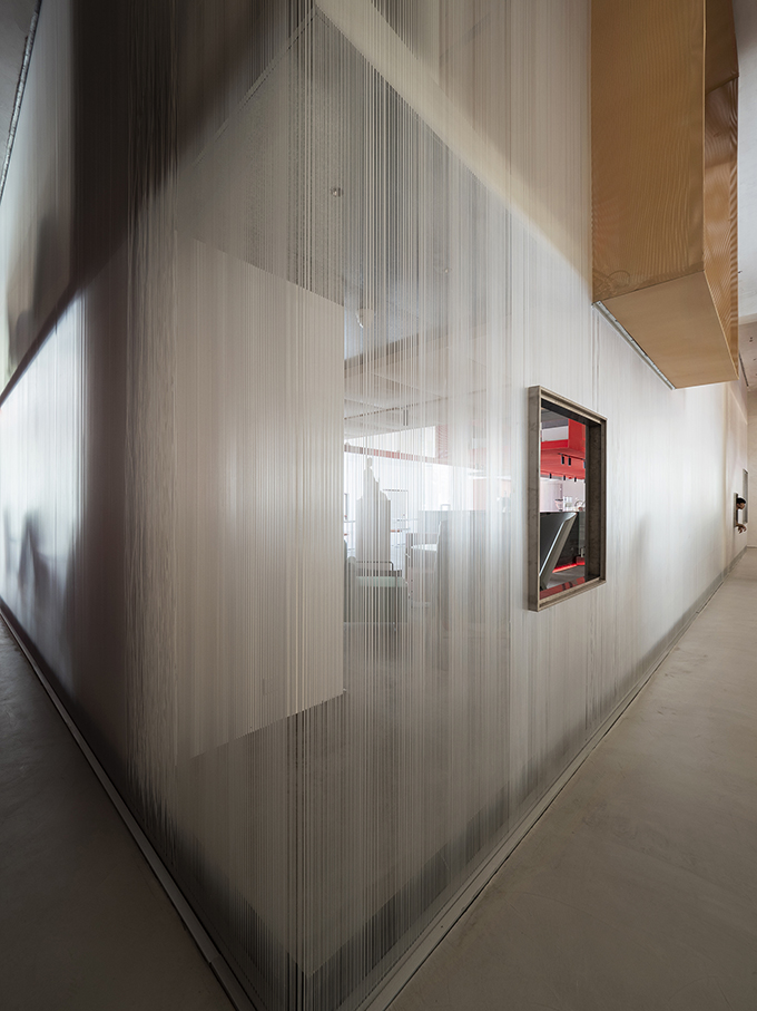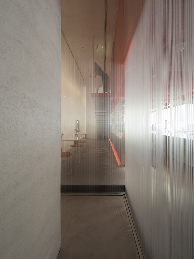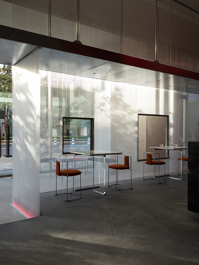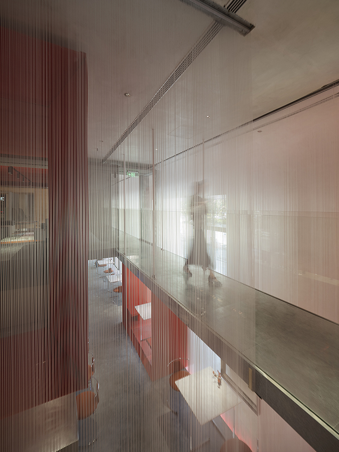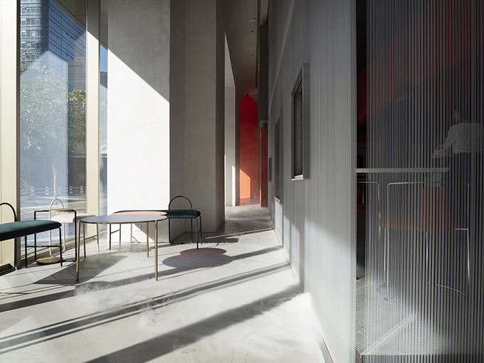 The surface layer of the interior architecture here is like theater curtains. We have chosen glass, metal mesh, galvanized sheet metal, nylon threads, and stainless steel to build a transparent and semi-transparent, hazy and solid contrast in the materials. Of those, nylon is the most expressive in showing hazily mysterious curtains. After trying materials of various flexibility, such as fishing lines and transparent PVC tubes, we use nylon threads to construct walls of lines that are varied in density. This not only upends people’s impression of thick and heavy walls but also changes the density of tree shadows as well as the images and shadows of trees and people as the angel and distance of viewing change.