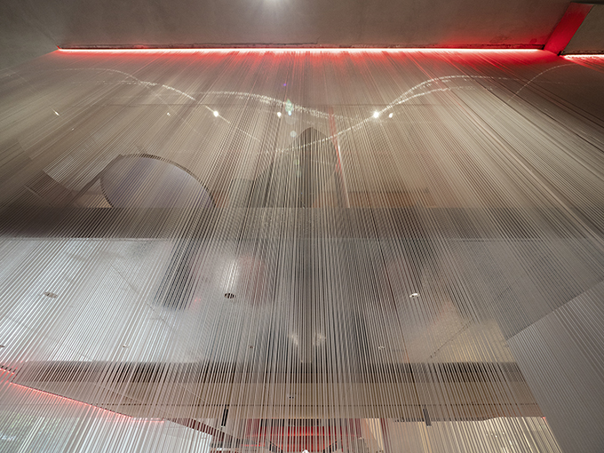 Light, drifty, and dreamy vapor abounds in the entrance hallway. Around 10,000 nylon threads were put together to make a semi-transparent shield. These two things together, sometimes fixed in place and sometimes drifty, seem to symbolize the complexity of interpersonal webs of relationships and correspond to the shape of relationships between oneself and all others in media in the digital age: relationships that are both transparent and hazy, both near and far, both building connections and a wall all at once, and both contradictions and mutually fortifyin. All this again and again shows the contemporary social media relationships that are both real and virtual, hard to draw a line of definition, both still and moving, and at all times forming a unique picture.