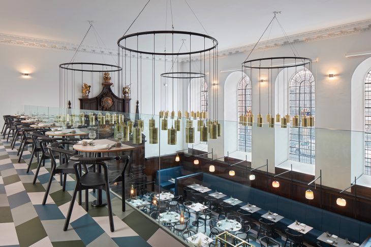 The restaurant is set on two floors; the ground floor design is focused towards the original dark timber church altar, while the mezzanine level allows views through a clear glass balustrade across the vast eight-metre high space and open kitchen.