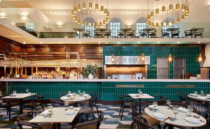The mezzanine level wraps around two sides of the restaurant offering views across the space and onto the open kitchen and bar below. Responding to the traditional architecture while respecting the fabric of the listed building, Michaelis Boyd has introduced modern chandeliers connected to the original ceiling by a series of lightweight fixings that have minimal impact on the original structure.