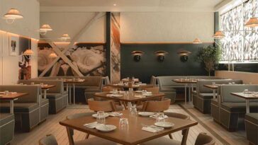 “The first impression of the place was a bit shocking – a lot of unnecessary decor, multi-level platforms, dividing the space in height and other interior peculiarities,” tell the authors. To start with, the architects cleared the space as much as possible to flood the interior with light. light and air in. The old windows were replaced with a new thin profile façade, the inner balconies were completely removed and the ladder was relocated, thereby creating a vertical axis of space development. The restaurant is roughly divided into two parts with the main hall on the ground floor and the banquet hall on the first floor. It was decided to split the ground floor space into two zones – the bar with a communal table and the main dining room with the help of three-meter seafood showcase, wine racks, and refrigerators.