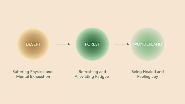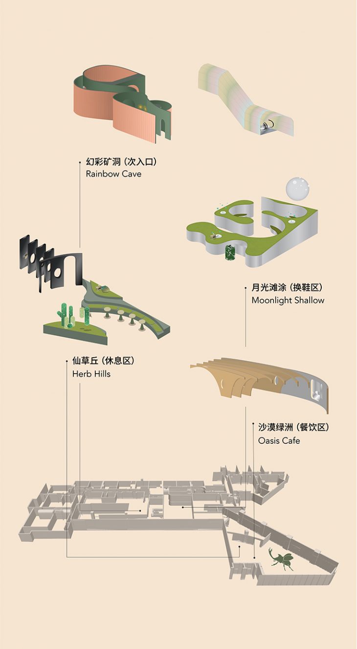 The project is situated at a popular pedestrian shopping street in Chongqing. Set on the third floor of a shopping mall, the space can be directly reached via elevators. The entrance area features several curved walls, providing customers with multiple paths to enter the inside areas. It refers to the desert in the beginning of the journey to explore the forest wonderland. The layered curve shapes echo the city’s unique mountainous terrain, so as to resonate with both the local customers and those from other cities. The showcase for displaying and selling related products is placed beside the curved walls, looking like a treasure box that brings a surprise to travelers in a desert oasis.
