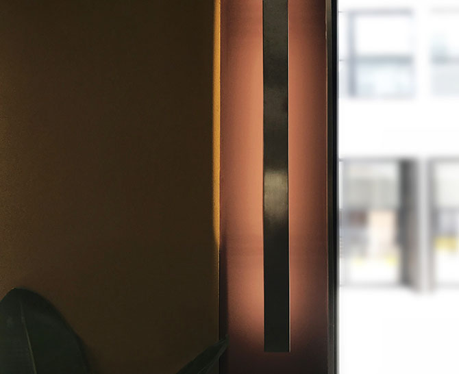 For many people, the first impression of INKWOOD Restaurant is the color combinations. Andrea says, “The colors of wood, ink and sauce remind me of the color scheme often used by Italian painter Giorgio Morandi. I want guests to feel the intensity and temperature of wood and ink, and to ‘taste’ the sauce and ingredients with their eyes first.” In the visual design, a series of flowing color bubbles are used to represent “INK”; while in the main logo, the mirrored writing of “INK” and “WOOD” are simply connected by a well-defined golden stroke. The designers didn’t want to use too many curves in the space to distract customers’ attention from food. Therefore, interesting color and material combinations are used in the space to express the concept of “INK” and “WOOD”, highlighting that stroke of symbiosis in the form of a brass stripe, which is on the floor, the wall, and the furniture, as well as in the custom-made light fixtures.