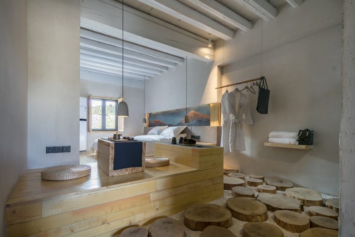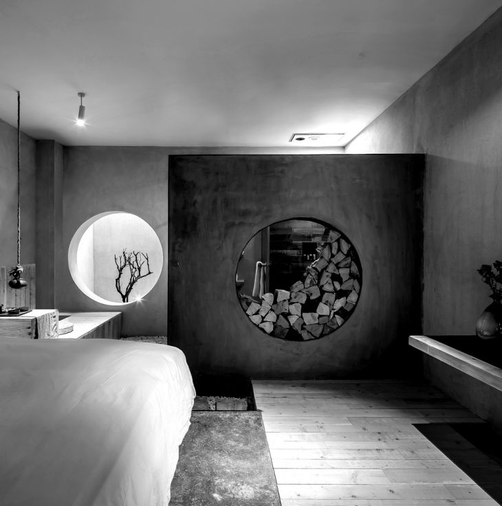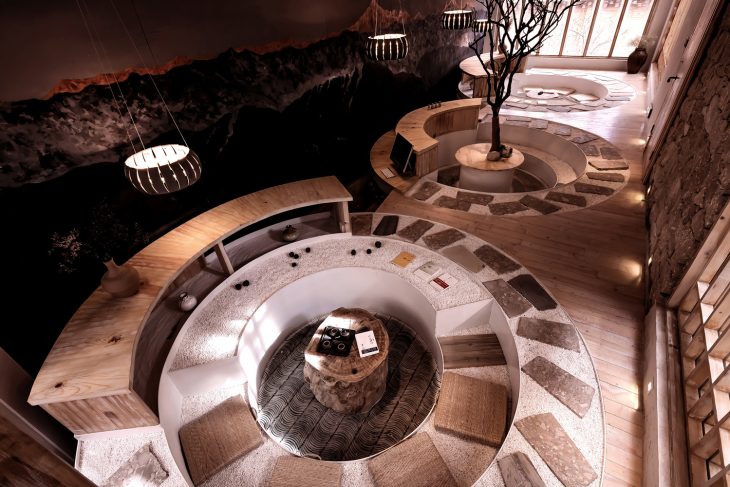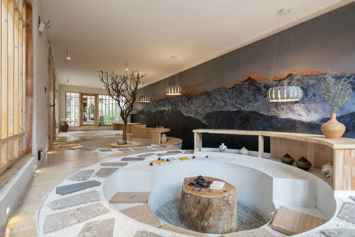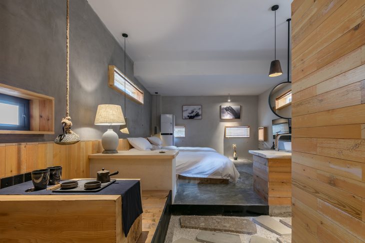 KARESANSUI are composed of six small buildings and an old Tibetan house, visually, the two buildings where the restaurant and lobby located are floating in the air. Bridged by corridors, the buildings are undulating and interweaved with each other. There are 15 guest rooms in total , in addition, there is a lobby, a restaurant and a tea room. Unique indoor design could be found in each guests room, while giving guests great sense of privacy , it shows the beauty of new oriental Zen. One of the buildings keep the original Tibetan structure, and local Tibetan elements are added to its architectural and interior design. When designing the window, Xu Xujun made full use of the great view, making it possible for guests to enjoy the painting-like scenery of blue sky, white clouds, sunrise and sunset just by looking out of the window.