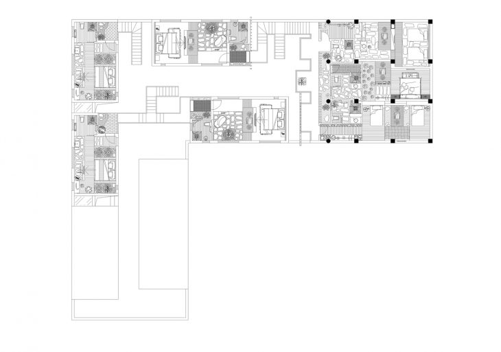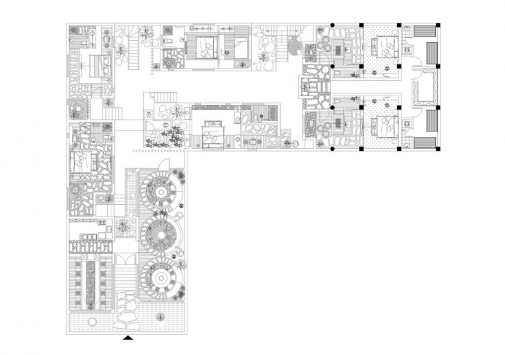 By chance the client found Xu Xujun two years ago. After a few hours’ communication at the first meeting, the client requested that Xu Xujun provide a brief proposal first. At that night, Xu Xujun drew a rough draft by hand: elements of Oriental Zen were added to the overlapping connected buildings , and Tibetan style of ancient city Shangri-La was taken as a smooth transition, thus a simple hostel which presents the beauty of nature was gradually shown. The client thought highly of the draft, thus a story about the original design of KARESANSUI was unfolded…