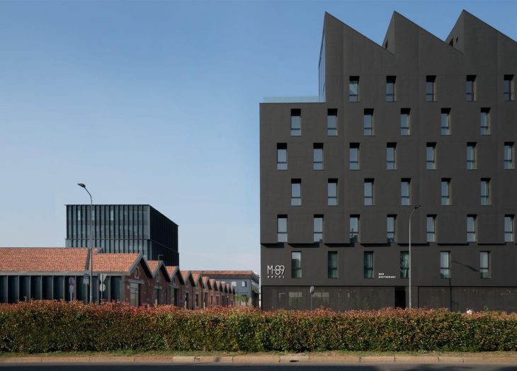 Opposite the building, there is the rhythmic series of brick blocks of the Caproni factory, with their shed roof and industrial archaeology charm: the M89 Hotel – the new four-star destination at number 89 of via Mecenate– faces the factory halls that one hundred years ago hosted one of the leading aviation companies and which are now home to Gucci, after a meticulous renovation and expansion project by Piuarch.