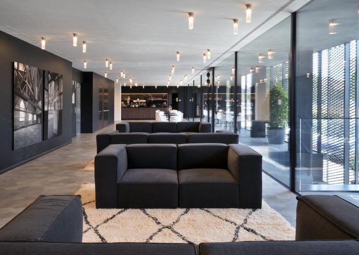 On the outside, the hotel hints at the outline of factory halls: the ground floor features a wide glass wall with a metal grate, at the same height of the industrial buildings as an ideal continuation of the permeable facade on the street. The roof, instead, reinterprets the industrial shed system in a contemporary key: the cover takes the shape of a fascinating complex profile and takes a step back to leave room to the terrace framed by full-height glass walls. The roof also hosts the panoramic restaurant, with a view of the Milan skyline, open both to hotel guests and to the public.
