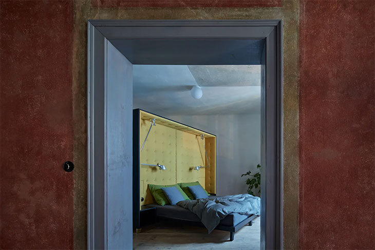 The ground floor of Masná 130 houses a vibrant café, serving as a hub for locals and visitors. With its welcoming atmosphere and emphasis on community engagement, the café has become a beloved fixture in the town’s social fabric. Upstairs, the owners have transformed the space into a thoughtfully curated apartment, reflecting their own lifestyle and values. Designed to be both functional and aesthetically pleasing, every aspect of the apartment has been carefully considered, from the rich, dark tones of the living area to the serene simplicity of the bedroom.
