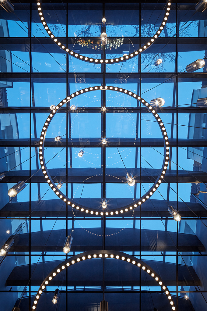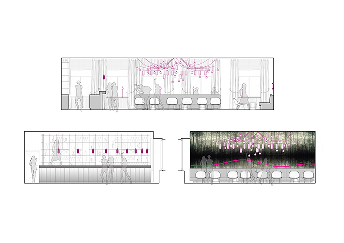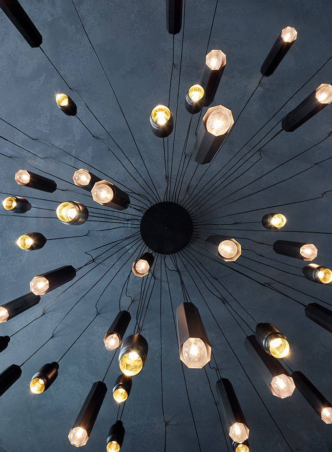 The central main bar is a dominant unit, with a moon silhouette floating above the yard. Three big round pendant lights and groups of metal pendants above it create a reflection on the glass ceiling. This effect evokes a starry night and creates a deep and magical feeling.