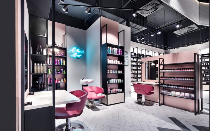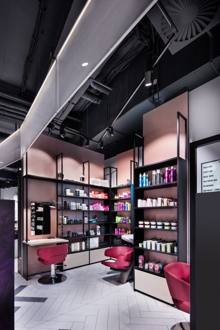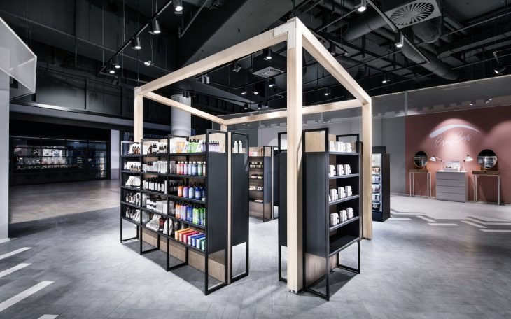 The holistic brand experience is the focus of the design concept. Everything revolves around what the consumer is looking for in stationary retail: individualization, emotionality, social exchange and exclusivity. Even from the outside, a digital shop window beckons as well as the view into the store with its live promotions. The classic shop is transformed into a showroom, and the brand gets a face. Extravagant product stagings, pop-up spaces for niche products and a spacious seating landscape are featured in this open spatial concept that intuitively guides consumers through the world of experience. Hair styling bar, brow bar, “Men’s World”, make-up school and exclusive workshops with the stars of the beauty scene each have a place in individual units, individually designed and with a strong atmospheric effect.