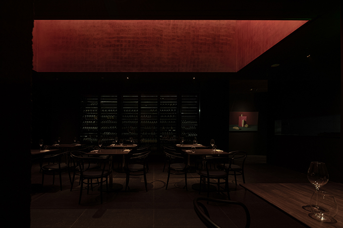 Within the fine dining area, different elements including the deep red ceiling, rough wall surfaces, pure black furniture and transparent glasses are interwoven together, which renders the space classy and endows it with a sense of occasion.