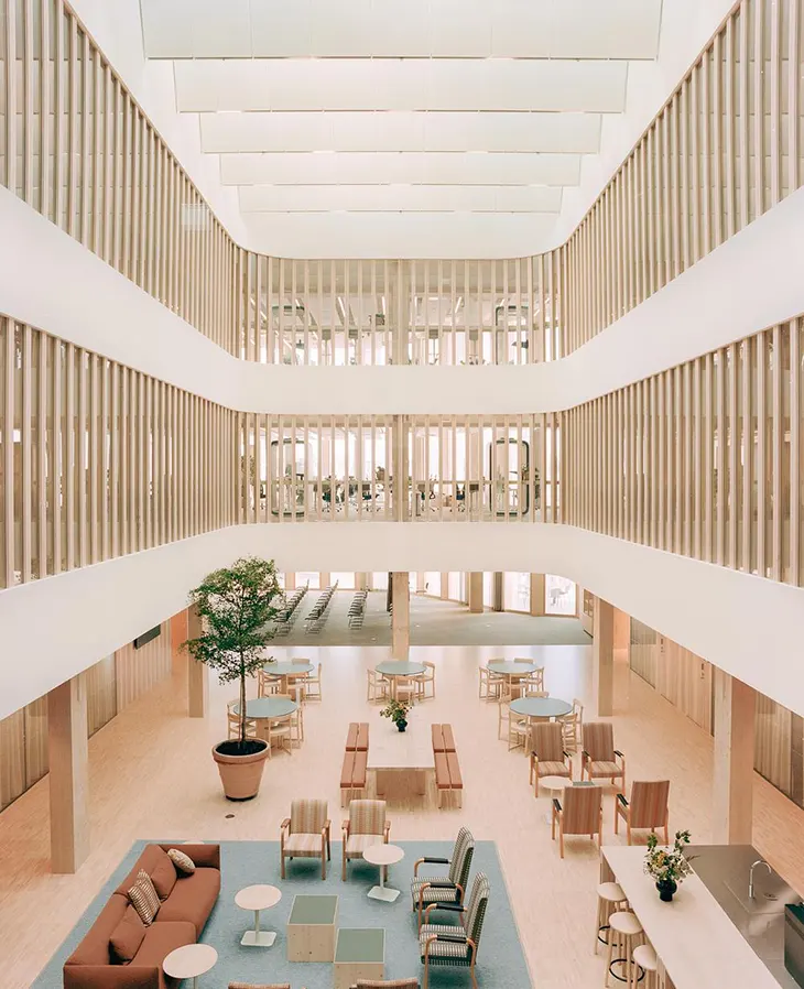 Inside, exposed spruce structures and refined spruce and ash detailing highlight the expressive range of wood as a primary material. Interior spaces prioritize adaptability, allowing layouts to change over time without compromising the building’s integrity. The design emphasizes materials that age naturally, reinforcing the project’s long-term perspective.