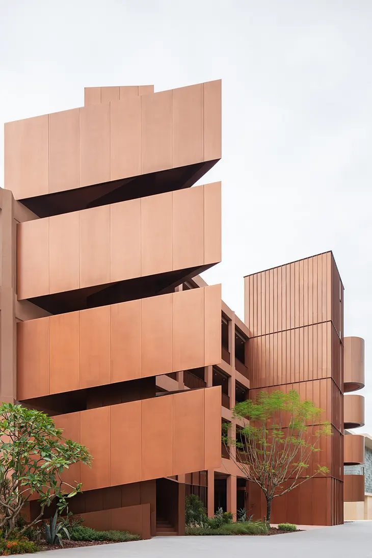 Organised across four levels, the ground floor operates as an openly accessible public realm, housing a bookstore, café, and light dining spaces. Above, Levels 2 to 4 accommodate 18 guestrooms oriented toward river views. A defining feature of the building is the continuous colonnade that wraps the structure, formed not by solid walls but by a series of polygonal columns. This semi-outdoor layer dissolves clear boundaries between inside and outside, creating a porous threshold that invites movement, air, and light through the building.
